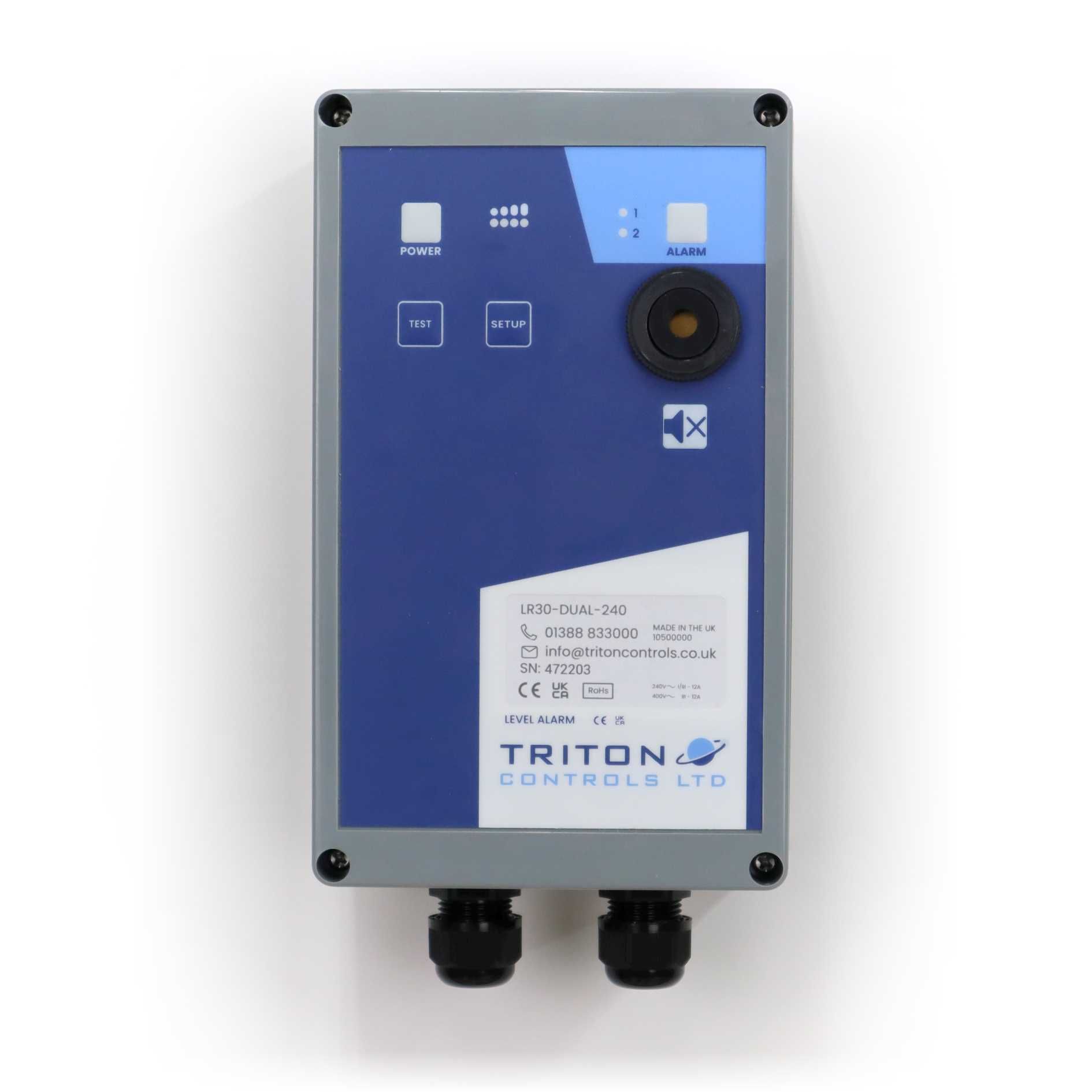 Each dual alarm comes fitted with an internal backup battery, capable of over 48h running time. Along with the battery, the unit is fitted with an auxiliary relay output [volt-free output] as standard.